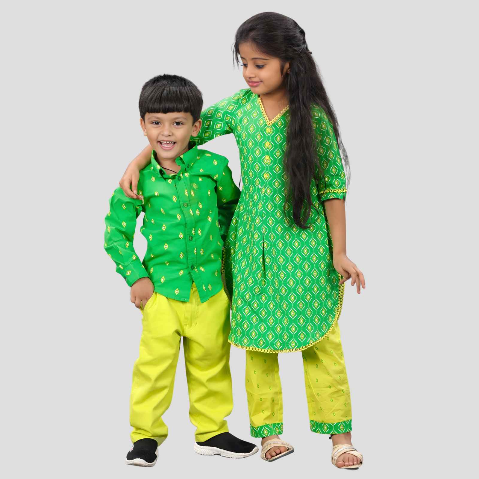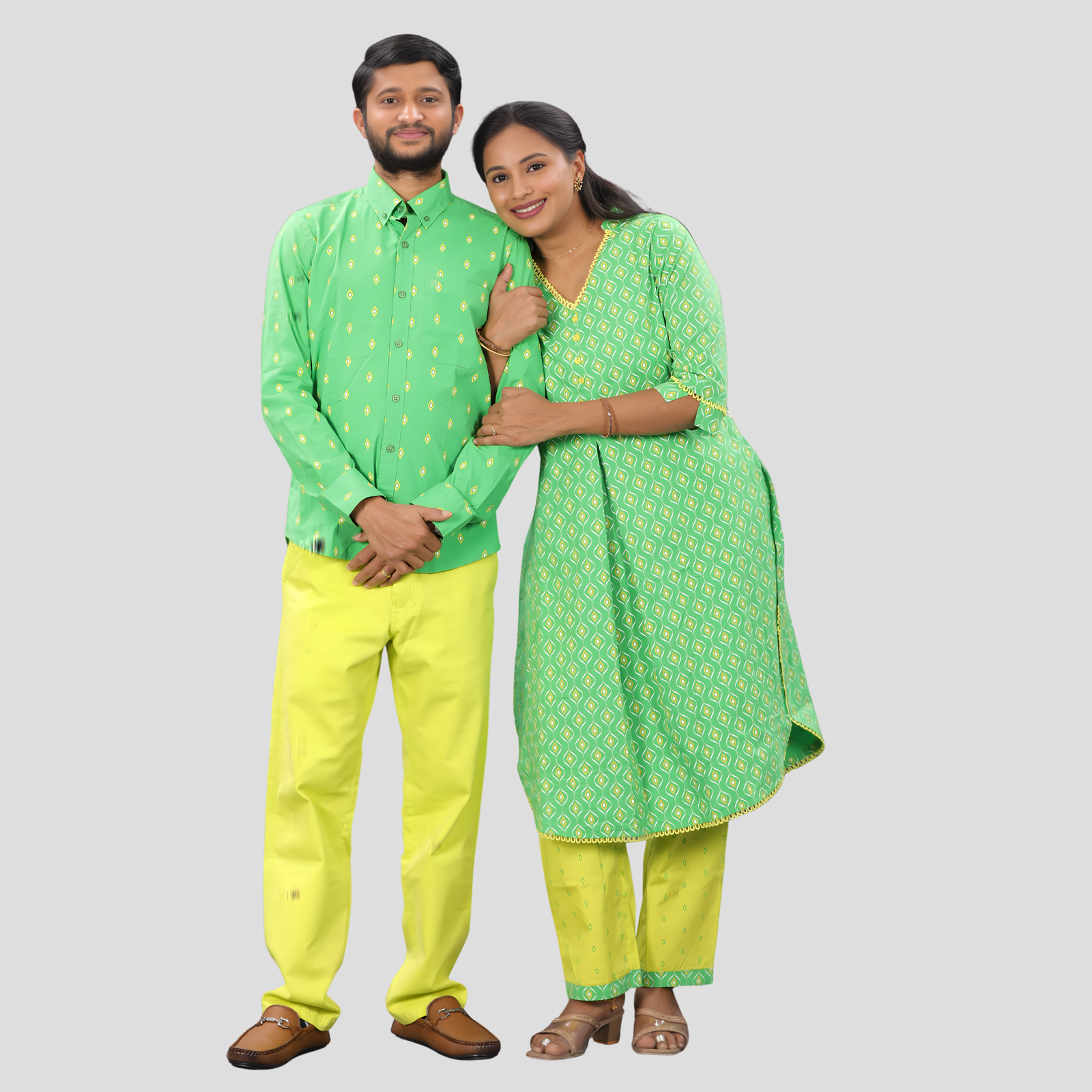 Stylish matching combo featuring a button-down shirt with trouser fit bottom and pleat kurti paired with palazzo. Classic green and sulphur spring colours, soft fabric, perfect for office, festive and everyday wear.